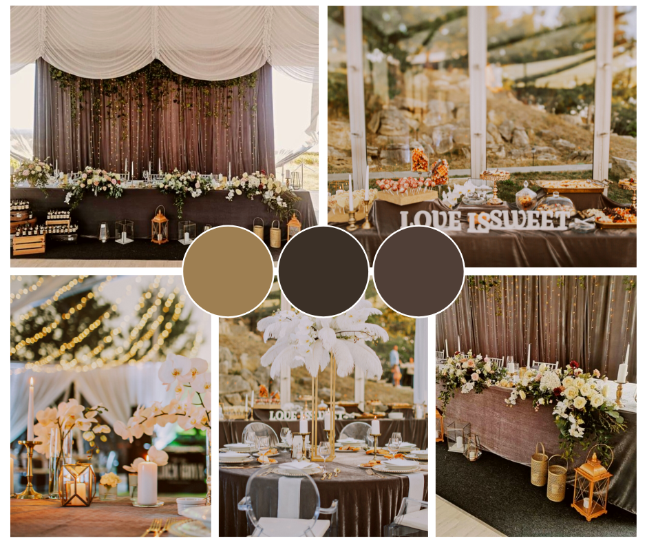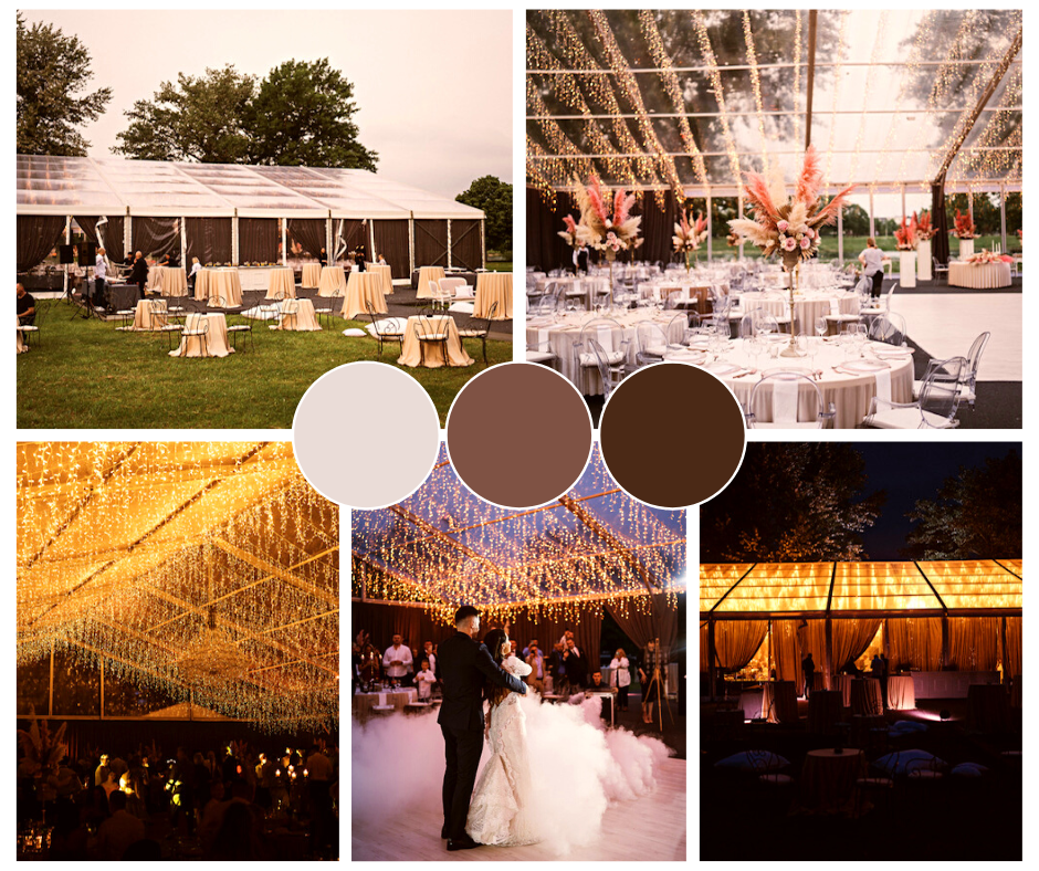 Jesen donosi cijelu paletu boja koje možete iskoristiti u uređenju vjenčanog paviljona. Od klasične žute, narančaste, crvene i bordo preko metalnih nijansi bakra i zlata do neutralnih tonova. Želite li da vaš interijer izgleda odvažno i dramatično, uredite ga u crno-bijelim tonovima te ih obogatite zelenim aranžmanima u vazama ili visećim instalacijama. Zanimljivo će izgledati i kombinacija žute i plave.