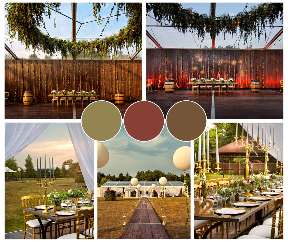 Bei der Dekoration des Pavillons ist der rustikale Stil selbstverständlich. Kombinieren Sie verschiedene Texturen und Farben und bringen Sie die schönsten Elemente aus der Natur ins Interieur; Zweige, Blätter, Grün und saisonale oder wilde Wildblumen. Da im Herbst Erntezeit ist, können Sie auch verschiedene Früchte, Gemüse und Kürbisse wie Äpfel, Beeren usw. in die Dekoration einarbeiten. Auch ein luxuriöser, antiker Look ist eine tolle Option. Sie können es erreichen, indem Sie Kupfer- oder Goldelemente mit Holz kombinieren. Wählen Sie Materialien wie Plüsch, die einen Eindruck von Wärme und Komfort vermitteln. Das Schlüsselelement ist die Beleuchtung. Große Kronleuchter oder Lichter in Reih und Glied sowie romantische Kerzen auf den Tischen sind ein Must-Have.